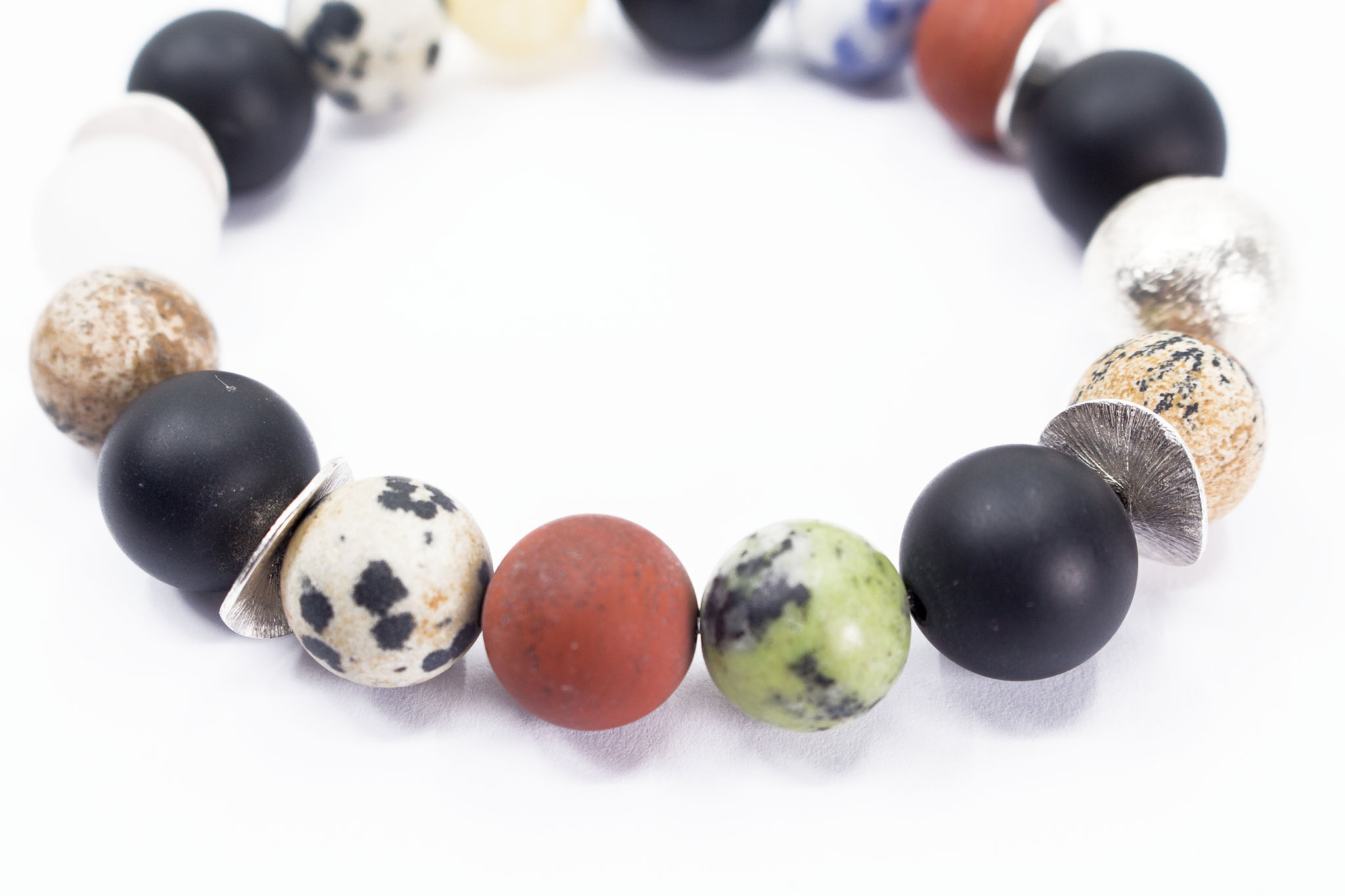 Entdecken Sie das faszinierende Armband Onyx bunt, ein echter Hingucker an Ihrem Handgelenk. Dieses einzigartige Schmuckstück vereint die Eleganz von 14mm großen Onyx-Steinen mit der lebendigen Farbenpracht 12mm bunter Edelsteine. Die hochwertigen Zwischenelemente aus 925er Sterling Silber verleihen dem Armband eine edle Note und sorgen für einen stilvollen Auftritt. Mit einer Länge von 20 cm passt es sich optimal Ihrem Handgelenk an und bietet durch den elastischen Silikonfaden einen hohen Tragekomfort. Ob zu besonderen Anlässen oder im Alltag, dieses Armband ergänzt jedes Outfit und zieht alle Blicke auf sich. Gönnen Sie sich diesen exklusiven Schmuck, der nicht nur modisch, sondern auch aufgrund seiner hochwertigen Materialien besonders langlebig ist. Verleihen Sie Ihrem Stil das gewisse Etwas mit dem Armband Onyx bunt.
