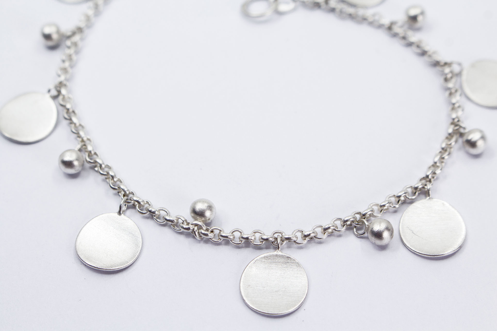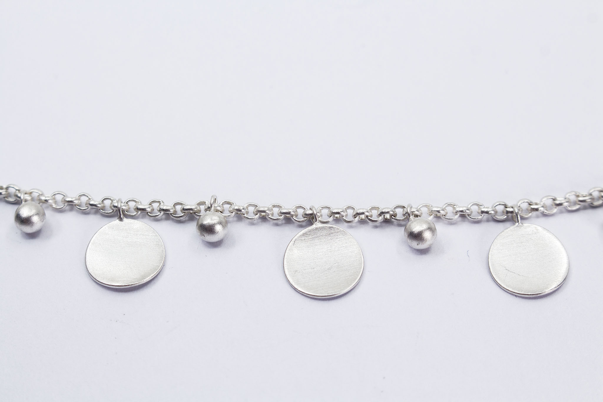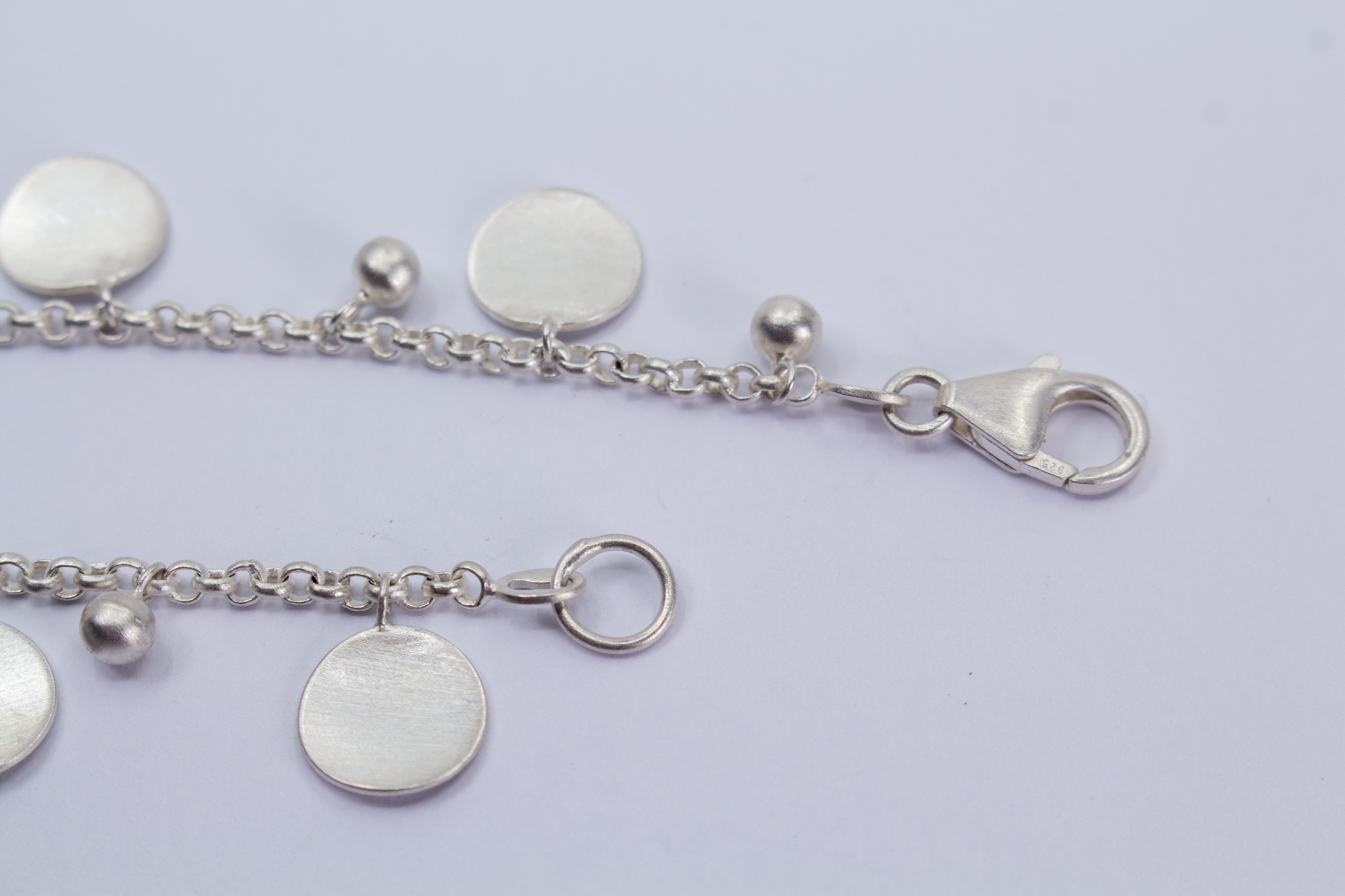 Entdecken Sie das edle Armband aus 925er Sterlingsilber, das Eleganz und zeitlosen Stil perfekt vereint. Mit einer Länge von 20 cm schmiegt sich dieses Schmuckstück angenehm an Ihr Handgelenk und sorgt dennoch für einen sicheren Halt dank des praktischen Karabiner-Verschlusses, ebenfalls aus 925er Sterlingsilber gefertigt. Die feinen Details – Plättchen mit einem Durchmesser von 1 cm, Kügelchen von 4 mm und das zarte Kettchen von 3,5 mm – verleihen diesem Armband seine einzigartige, stilvolle Optik. Ideal für jeden Anlass, lässt sich dieses Armband sowohl zu alltäglichen Outfits als auch zu besonderen Gelegenheiten kombinieren. Gönnen Sie sich oder einem geliebten Menschen dieses exquisite Schmuckstück und setzen Sie glänzende Akzente im Alltag. Bereichern Sie Ihre Schmucksammlung mit einem Armband, das klassische Schönheit mit moderner Raffinesse verbindet.
