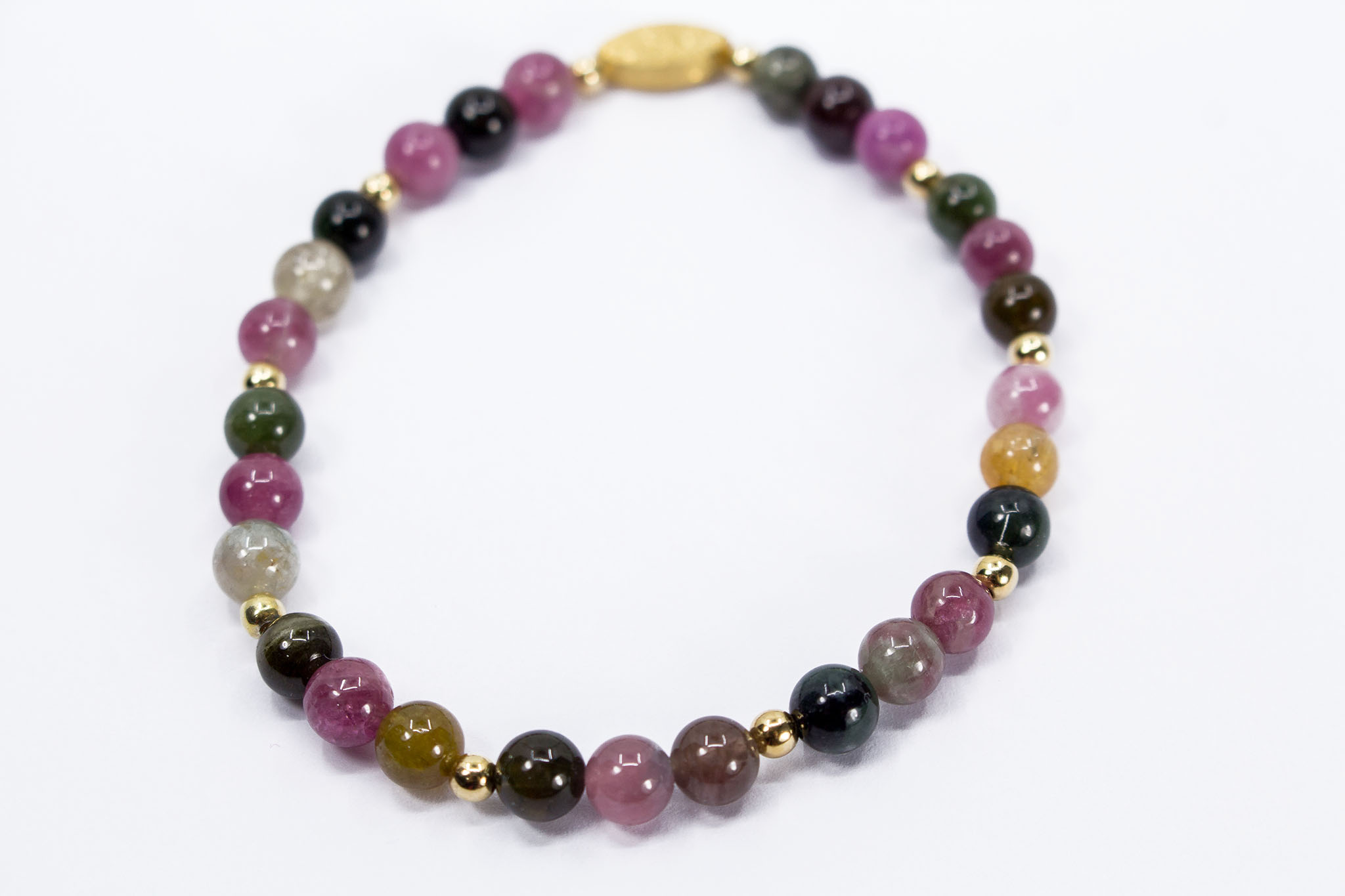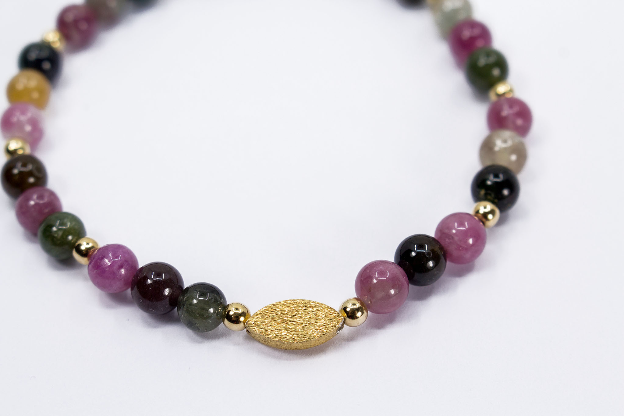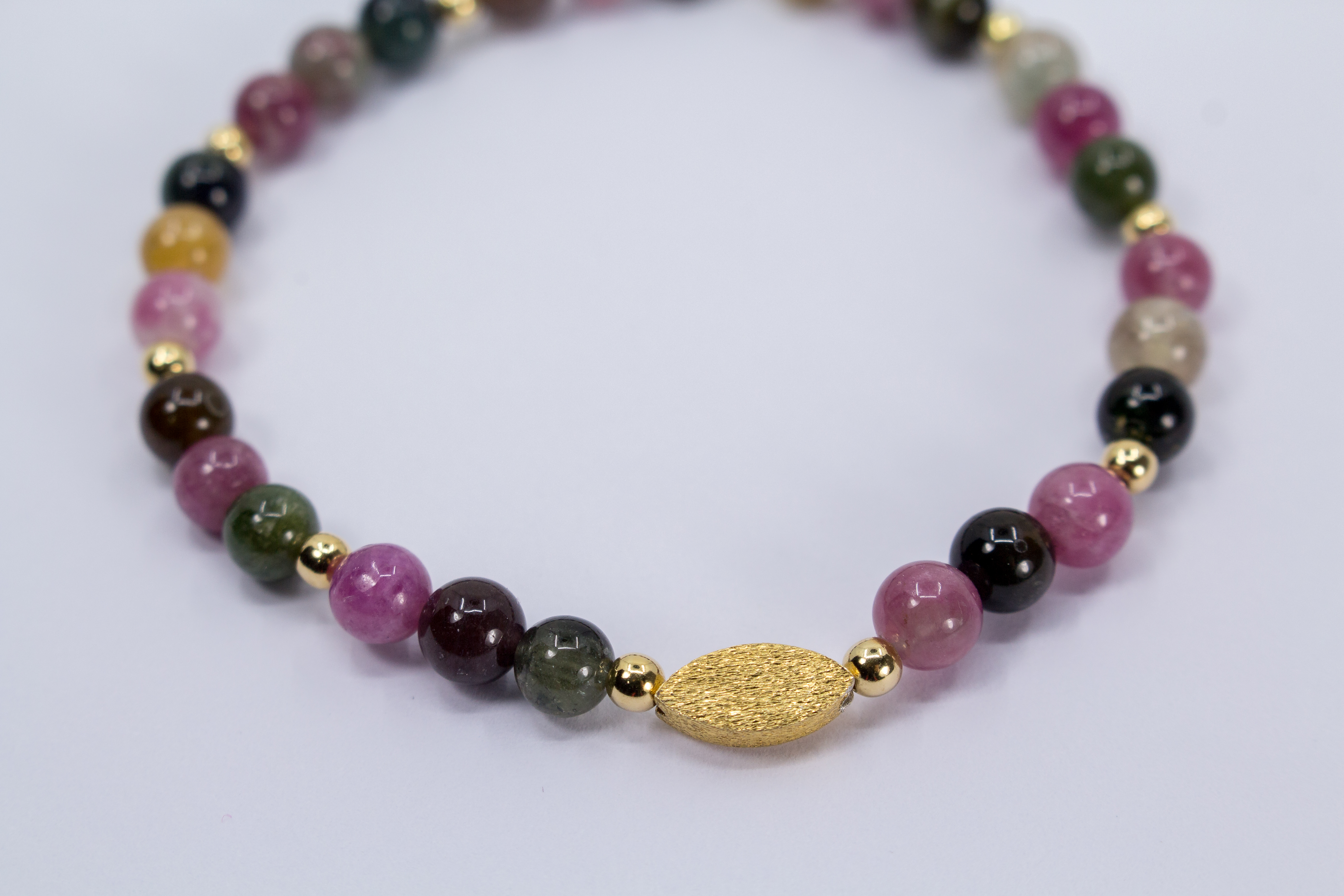 Entdecken Sie unser exklusives Armband aus Turmalin – ein stilvolles Schmuckstück, das Eleganz und natürliche Schönheit vereint. Die funkelnden Turmalin-Edelsteine mit einem Durchmesser von 5 mm sind sorgfältig auf einem dehnbaren Spezialsilikonfaden aufgereiht, was einen besonders angenehmen Tragekomfort garantiert. Zwischenteile aus hochwertigem, vergoldetem 925 Sterling Silber verleihen dem Armband einen edlen Glanz und setzen filigrane Akzente. Mit einer Länge von 18 cm passt es sich flexibel Ihrem Handgelenk an. Das modische Design und die harmonische Farbkombination machen dieses Turmalin-Armband zu einem perfekten Begleiter für jeden Anlass – ob im Alltag oder zu besonderen Events. Bringen Sie Farbe und Eleganz in Ihren Look und profitieren Sie von der einzigartigen Wirkung des Turmalins – bekannt für seine schützenden und harmonisierenden Eigenschaften. Dieses Armband ist nicht nur ein edles Accessoire, sondern auch ein Ausdruck zeitloser Schönheit. Ideal als besonderes Geschenk oder als Highlight für Ihre eigene Schmucksammlung.