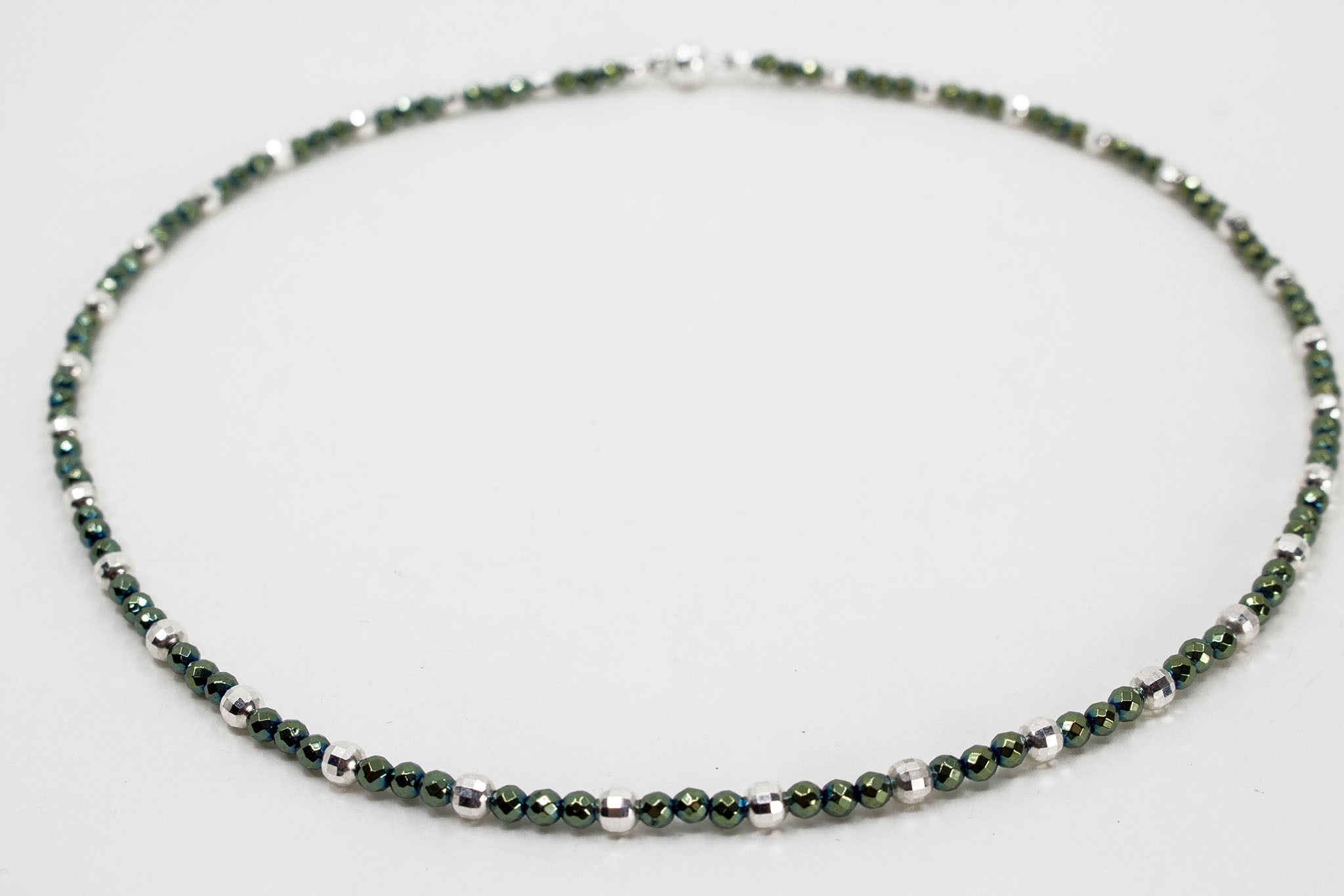 Das Collier besteht aus grünem Hämatit, welches die Grundlage für dieses Accessoire bildet. Der Verschluss ist eine Magnetschließe aus 925er Sterlingsilber Durch die Zwischenteile aus Silber wird das Collier abgerundet. Kombiniert wird das Collier mit grünem Hämatit, dessen Durchmesser 3mm beträgt. Der Zierbereich des Colliers wird von kleinen Silberkugeln mit einem Durchmesser von 4mm ergänzt. Mit einer Länge von 43cm bietet Ihnen das Collier eine attraktive Länge, mit der Sie Ihren Look aufwerten können.Länge 43cmDurchmesser Silberkugeln 4mmDurchmesser Hämatit 3mm
