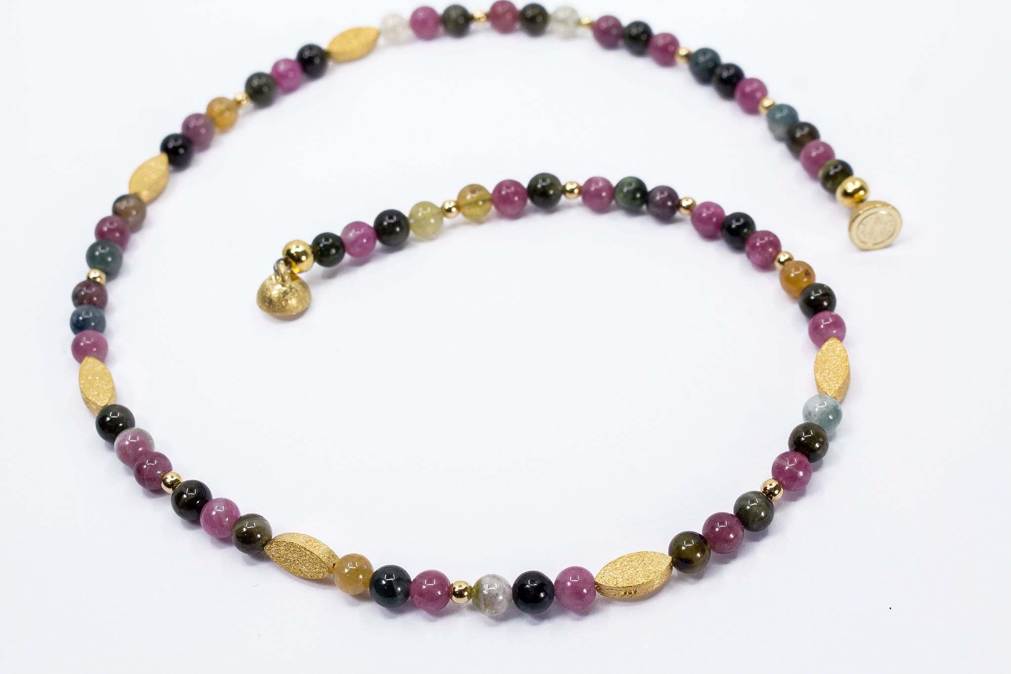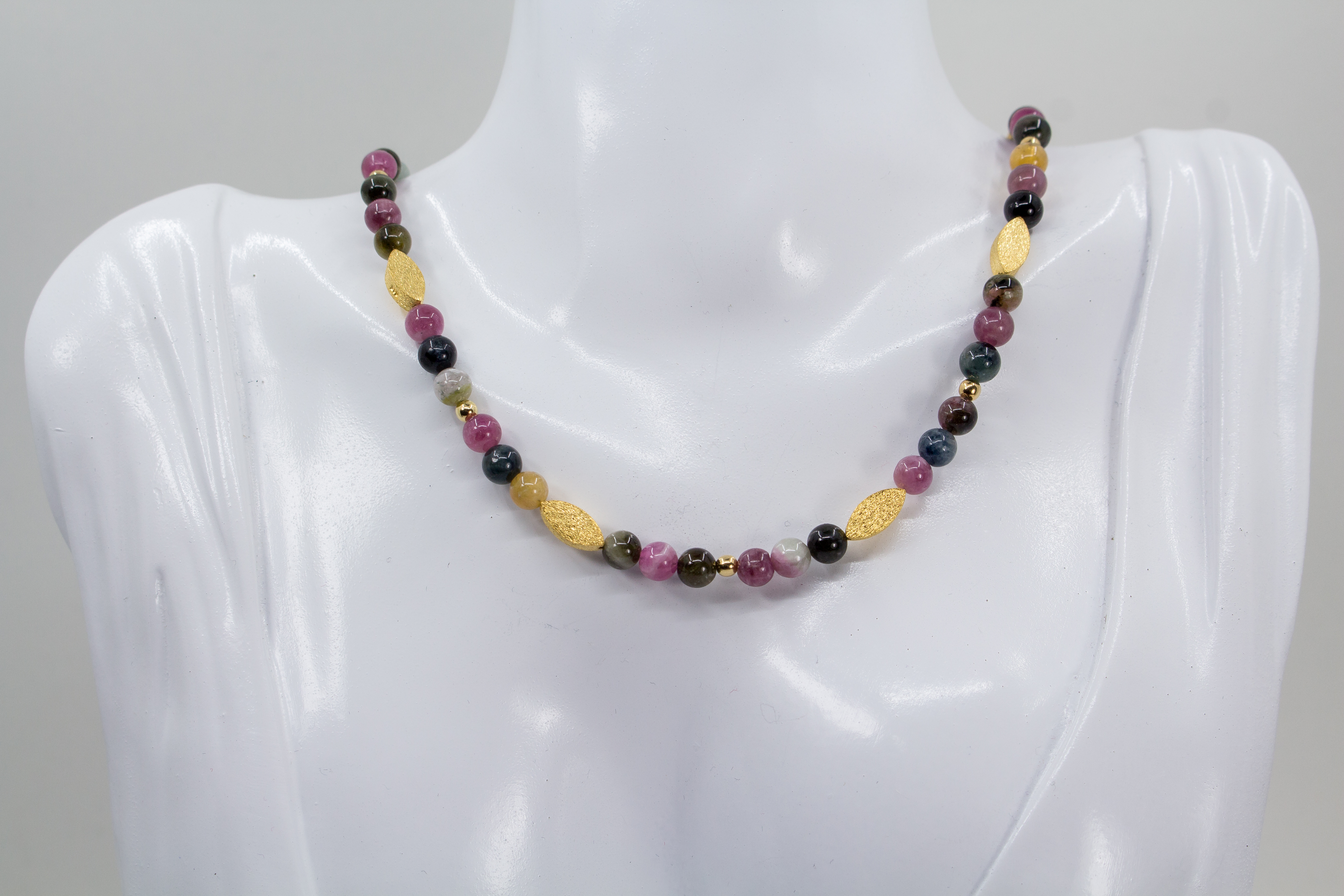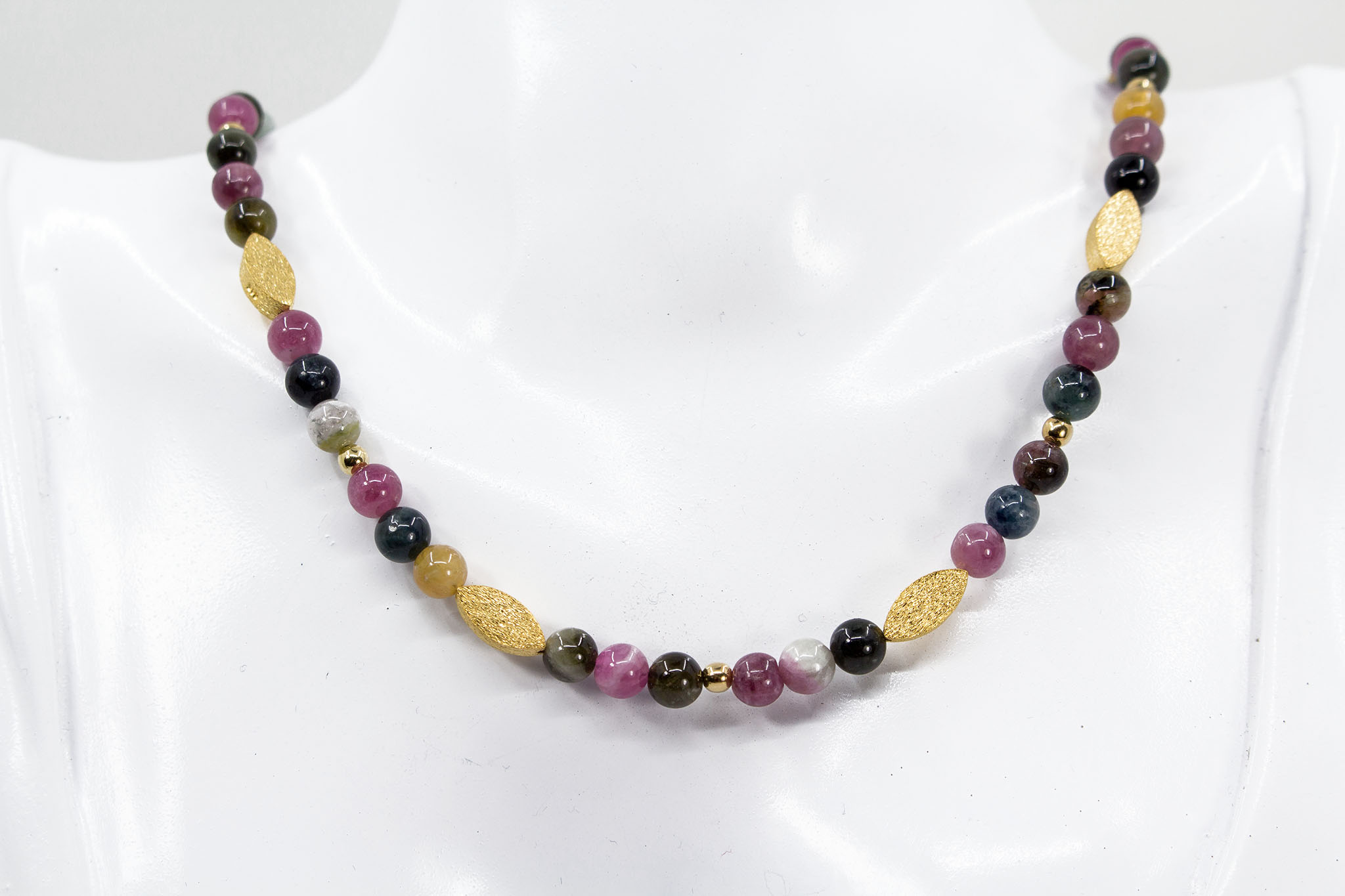 Entdecken Sie das edle Collier Turmalin – ein exklusives Schmuckstück, das zeitlose Eleganz und hochwertige Materialien vereint. Das Collier besteht aus echten Turmalin-Edelsteinen, deren feiner Glanz jedes Outfit veredelt. Mit einer Kettenlänge von 44,5 cm liegt das Collier angenehm am Hals und sorgt für einen stilvollen Akzent bei jedem Anlass. Die einzelnen Turmalin-Perlen haben einen Durchmesser von 5 mm und werden durch formschöne Zwischenelemente aus 925 Sterling Silber, vergoldet, geschmackvoll ergänzt. Ein praktischer Magnetverschluss aus vergoldetem 925 Sterling Silber gewährleistet ein müheloses An- und Ablegen der Kette und bietet sicheren Halt. Die Maße der filigranen Blättchen betragen 10 x 5 mm und unterstreichen die fein gearbeitete Optik des Colliers. Dieses Turmalin Collier ist das perfekte Accessoire für modebewusste Damen, die Wert auf Qualität und besondere Edelstein-Ketten legen. Ergänzen Sie Ihre Schmucksammlung mit diesem einzigartigen Collier aus vergoldetem 925 Sterling Silber und echten Turmalinen – ein Ausdruck von Eleganz und Individualität.
