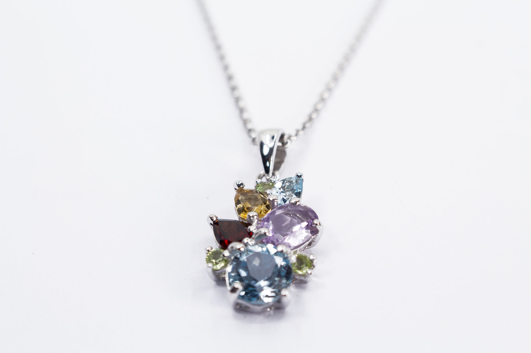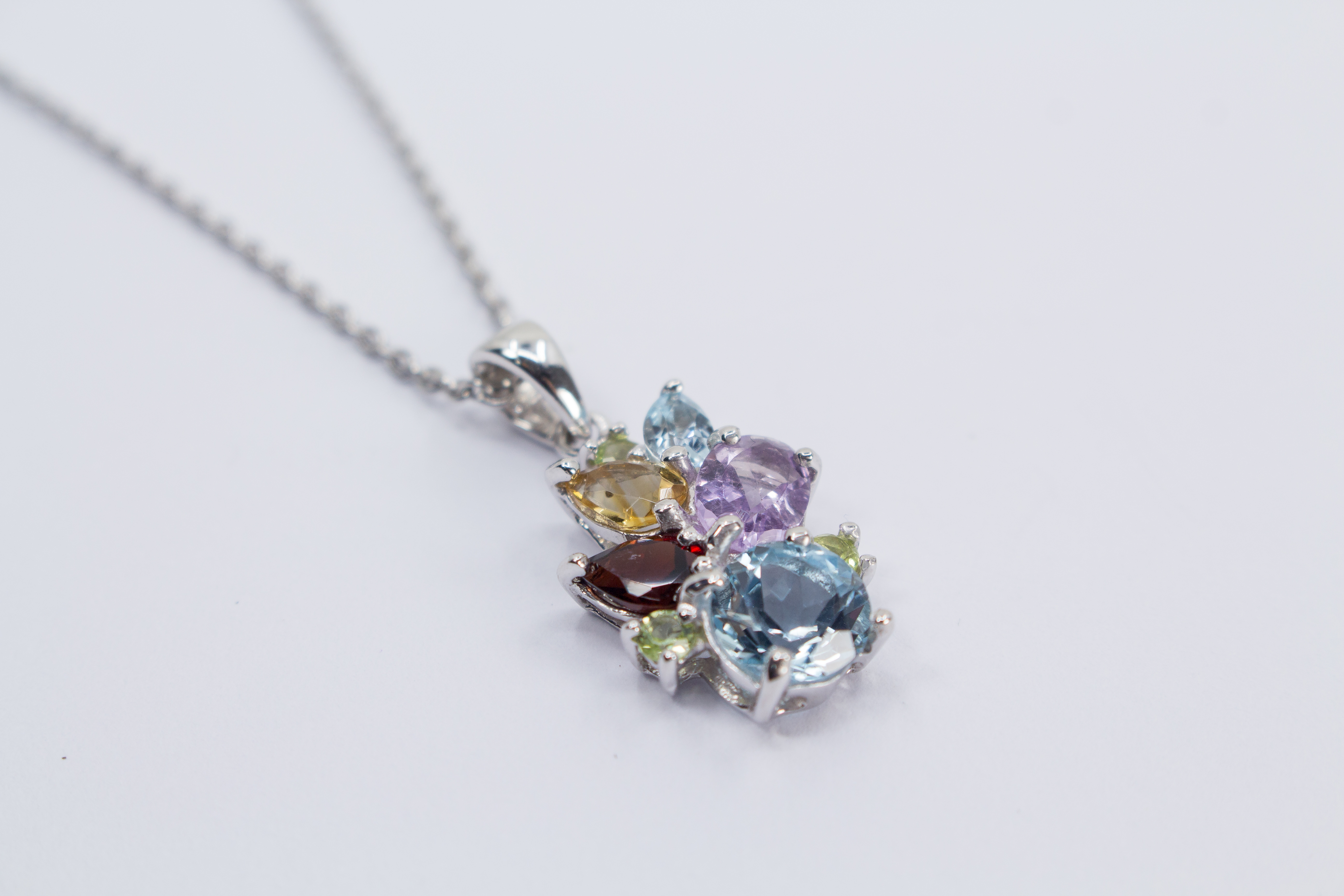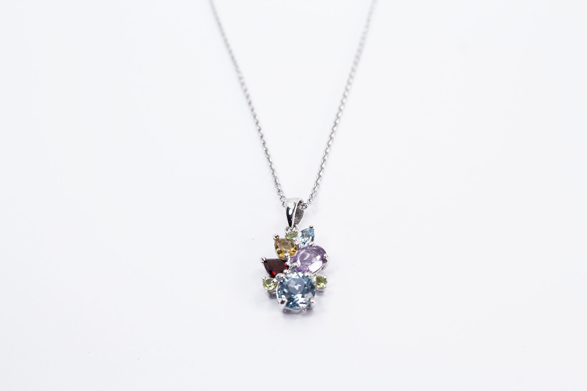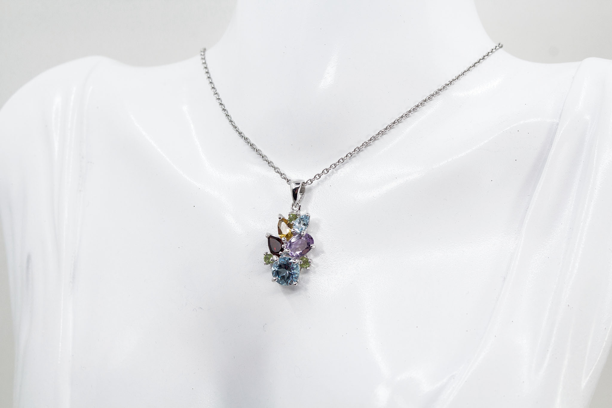 Entdecken Sie das elegante Collier "farbenfroh" – ein edles Schmuckstück, das mit seiner harmonischen Kombination aus echten Edelsteinen alle Blicke auf sich zieht. Dieses exklusive Collier aus hochwertigem 925 Sterling Silber vereint Amethyst, Citrin, Edeltopas, Granat und Peridot zu einem farbenprächtigen Design, das für besondere Akzente sorgt.Der Anhänger misst 17 mm x 13 mm und setzt die leuchtenden Edelsteine stilvoll in Szene. Die Kette ist dank des praktischen Verlängerungskettchens flexibel tragbar und kann individuell von 42 cm bis 47 cm angepasst werden. Der hochwertige Karabinerverschluss aus 925 Sterling Silber sorgt dabei für sicheren Halt und komfortables Tragen.Mit dem Collier "farbenfroh" verleihen Sie jedem Outfit – ob elegant oder lässig – einen einzigartigen und farbenfrohen Charme. Ideal als Geschenk oder zum Selbstverwöhnen, ist diese Kette ein außergewöhnliches Highlight, das in keiner Schmuckkollektion fehlen sollte. Entscheiden Sie sich für Qualität, Vielfalt und stilvolle Eleganz – mit dem Collier "farbenfroh" aus unserer Kategorie Ketten & Colliers.