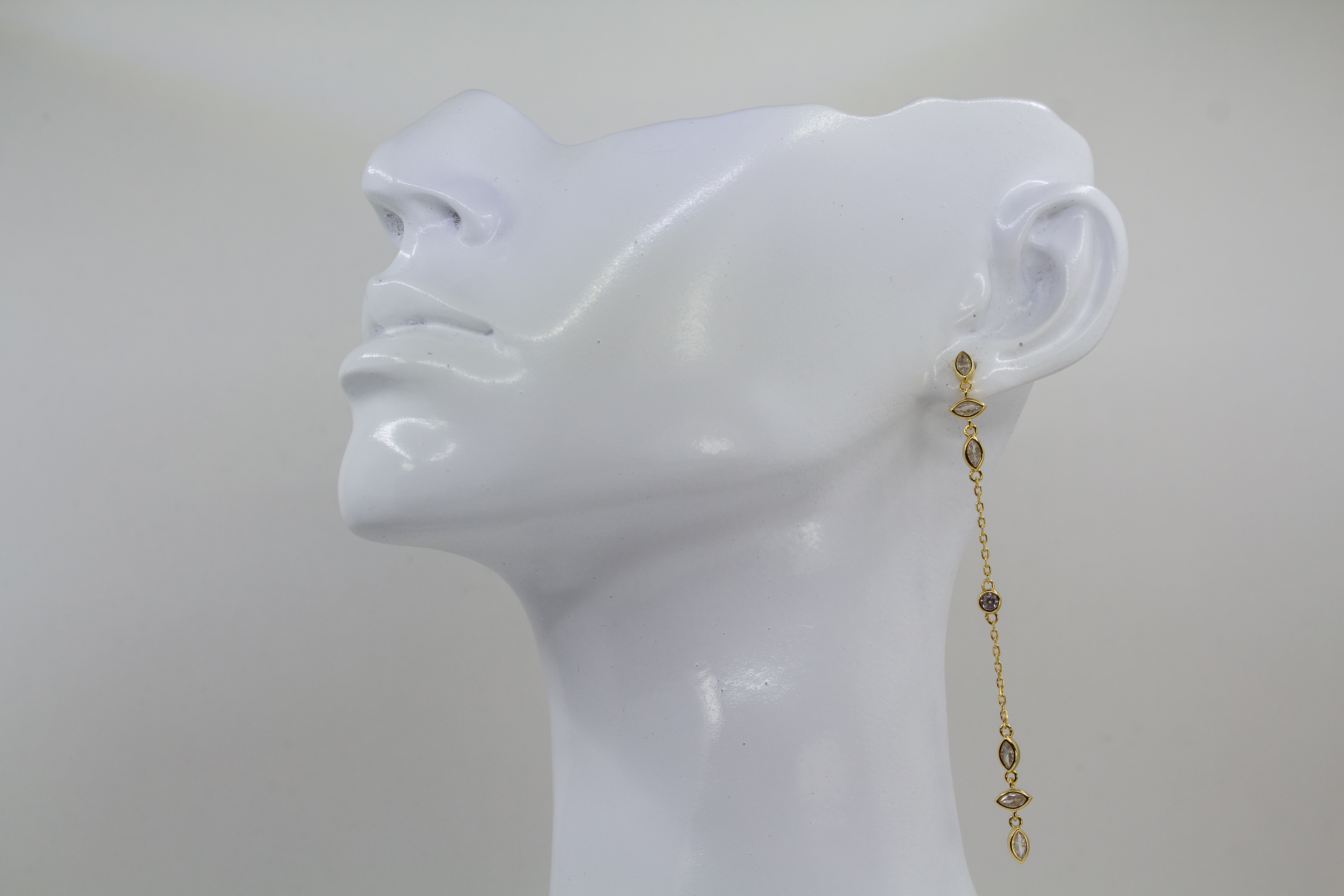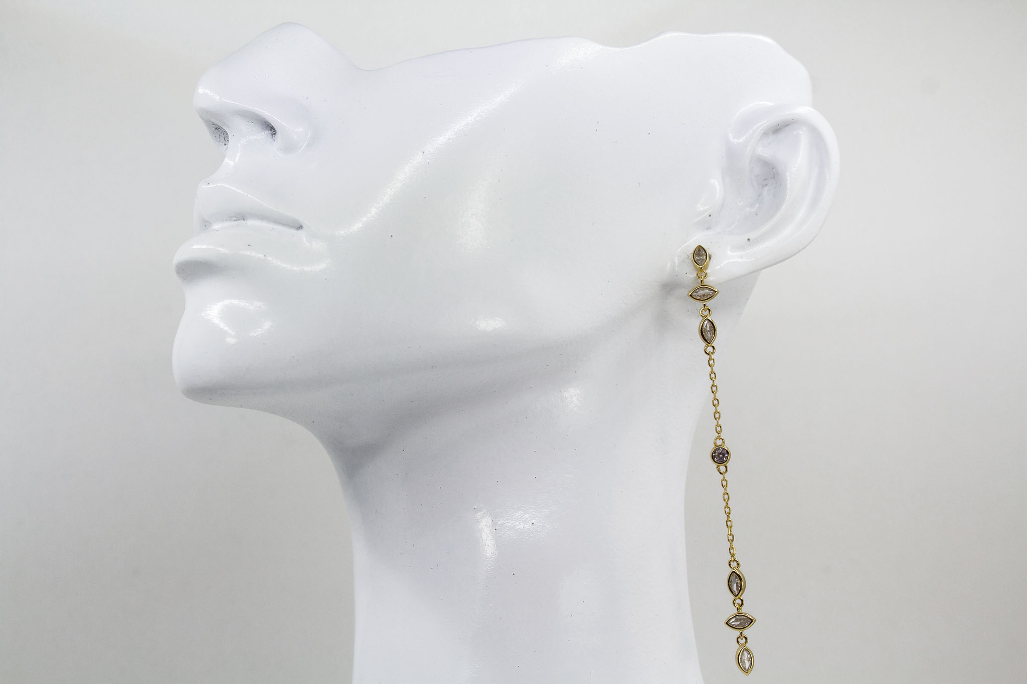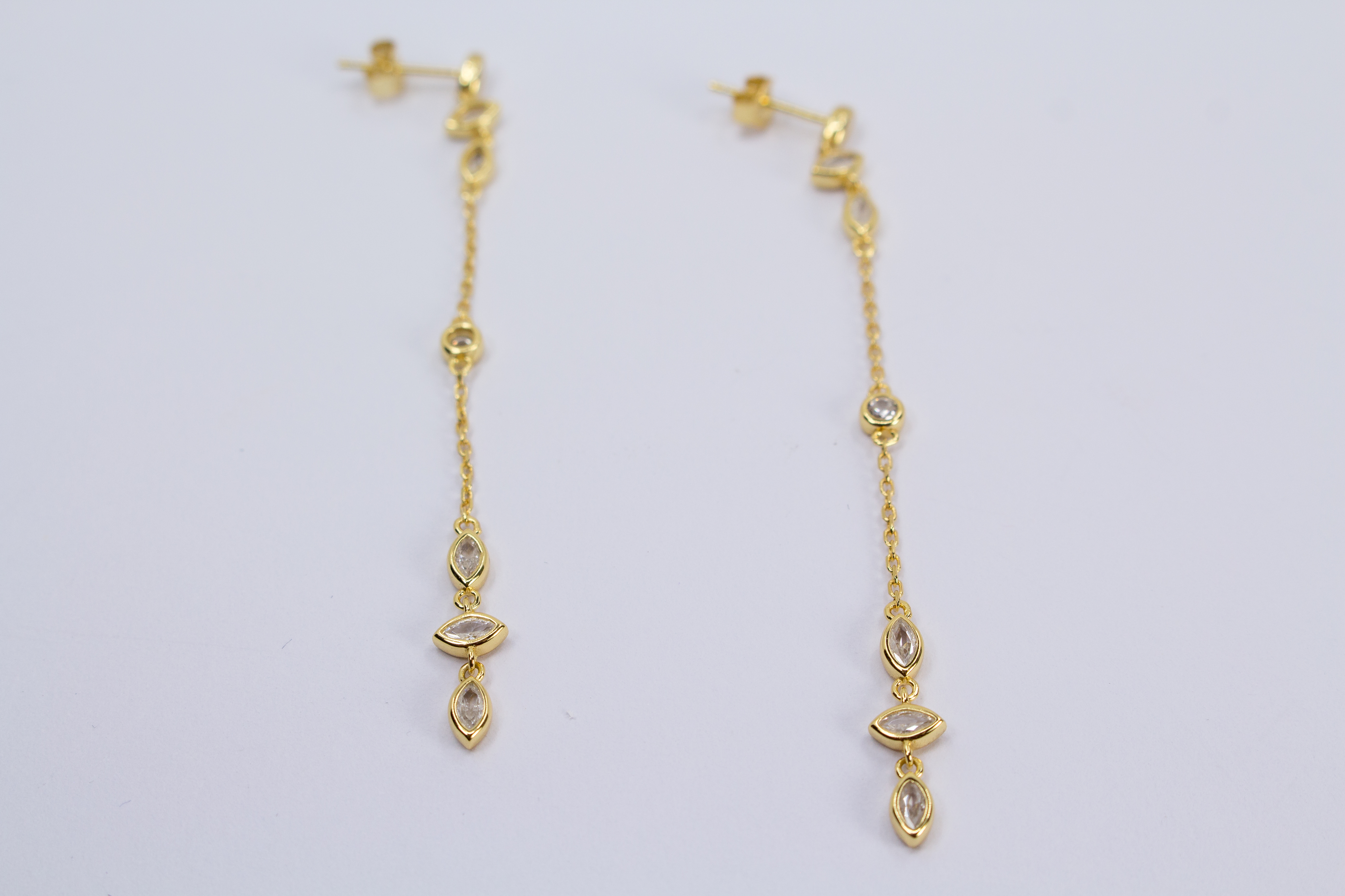 Entdecken Sie filigrane Eleganz mit diesen zart funkelnden Ohrsteckern aus vergoldetem 925 Sterling Silber. Die Ohrstecker bestechen durch ihre edle Verarbeitung und das zeitlose Design. Hochwertige Zirkonia-Edelsteine in runder Form mit einem Durchmesser von 3 mm sowie navetteförmigen Zirkonia mit einer Länge von 5 mm sorgen für ein faszinierendes Funkeln bei jeder Bewegung. Mit einer Gesamtlänge von 70 mm setzen diese Ohrstecker ein stilvolles Statement, ohne aufdringlich zu wirken. Das vergoldete 925 Sterling Silber verleiht dem Schmuckstück eine luxuriöse Ausstrahlung und ist zugleich hautverträglich. Diese funkelnden Ohrstecker sind die perfekte Ergänzung zu Ihrem Alltag, aber auch zu besonderen Anlässen und bringen Ihre Persönlichkeit glanzvoll zum Ausdruck. Ideal als Geschenk oder für das eigene Schmuckkästchen – gönnen Sie sich dieses elegante Accessoire für stilvolle Akzente in Ihrem Ohrschmuck-Sortiment.
