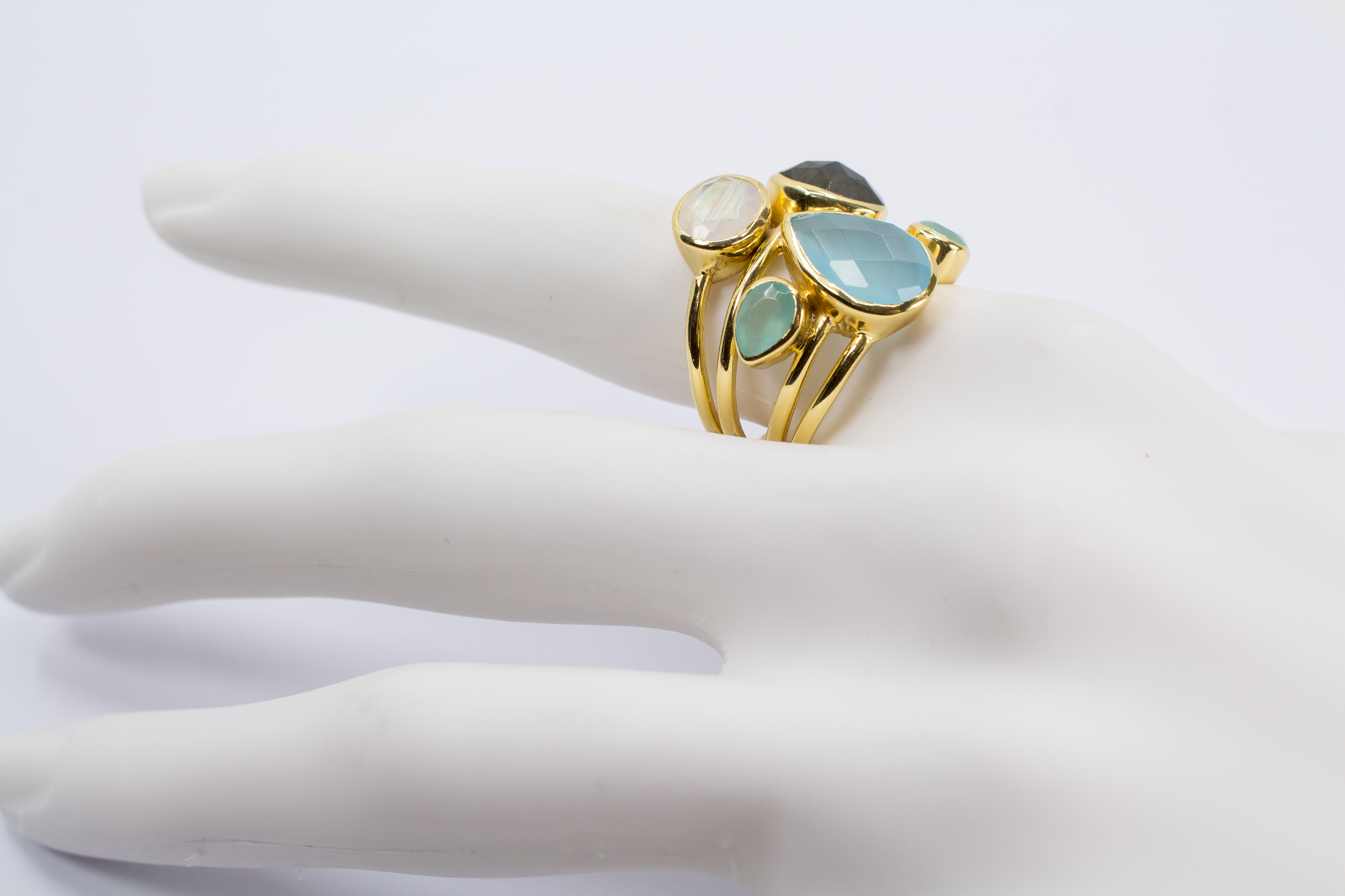 Entdecken Sie den bezaubernden Ring Aqua – ein exklusives Schmuckstück, das zeitlose Eleganz und moderne Raffinesse vereint. Gefertigt aus hochwertigem 925 Sterling Silber und edel vergoldet, zeigt dieser Ring eine eindrucksvolle Kombination aus handverlesenen Edelsteinen: Der leuchtend blaue Chalcedon, geheimnisvoll schimmernder Labradorit und strahlender Rainbow Mondstein verleihen dem Schmuckstück eine außergewöhnliche Ausstrahlung. Mit einer Ringgröße von 57 (Ø 18,1 mm) und einer imposanten Ringschiene, die oben 22 mm und unten 6 mm misst, bietet der Ring Aqua einen angenehmen Tragekomfort und ist ein stilvoller Blickfang an Ihrer Hand. Ergänzen Sie Ihre Schmucksammlung mit diesem einzigartigen Design und setzen Sie stilvolle Akzente – sowohl im Alltag als auch zu besonderen Anlässen.